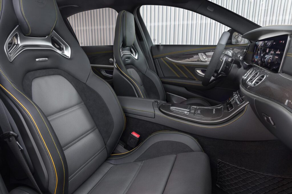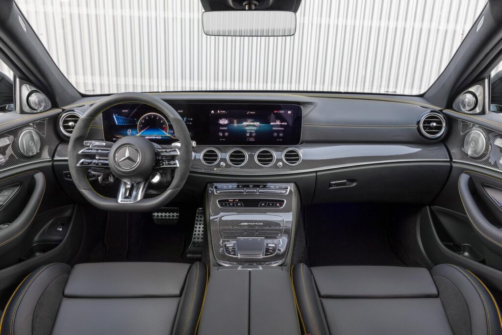 The E63 S gets a new fascia which includes a new Panamericana grille, flatter all-LED multibeam headlamps, and the firm’s three-pointed star has gotten a bit bigger. Mercedes-AMG says that it’s 27mm wider that give it a more dynamic appearance. The flared archers also house 19-inch 10-spoke light-alloy wheels for the standard model, and new 20-inch 5-twin-spoke light-alloy wheels for the S-Model. Round back the E63 S gets a more pronounced lip spoiler, with quad trapezoid exhaust outlets. There are three new colours to choose from Graphite Grey metallic, Cirrus Silver metallic, and Brilliant Blue magno.