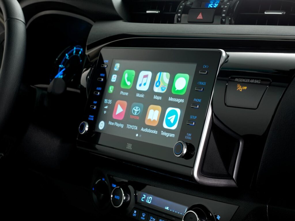 Looks wise, for a tougher appearance it has a large new grille at the front in fact the whole front of the Hilux looks more like an American pick-up truck if you ask me, some newly designed headlights with LED lights for the more expensive variants. Inside we get an interior that we are familiar with but with new technical improvements, the new instrument cluster has now been updated with a 4.2 information screen and in the center of the dash an 8 inch infotainment screen which will now have Apple car play and Android Auto functionality.