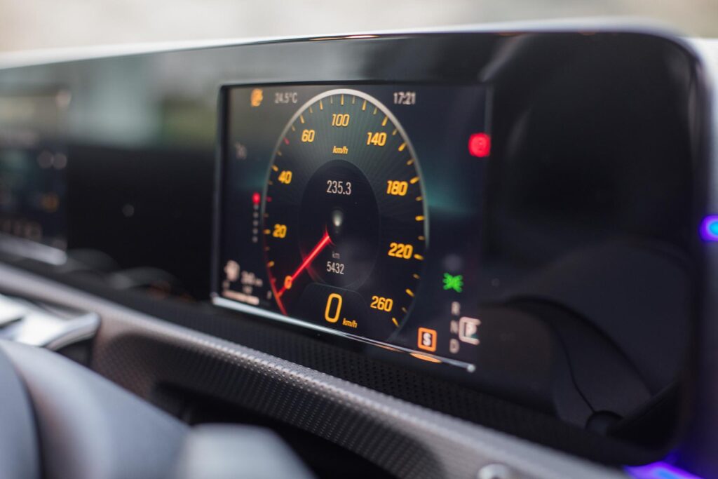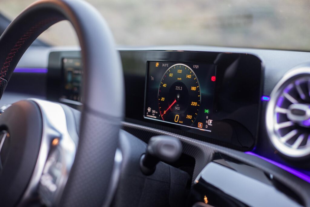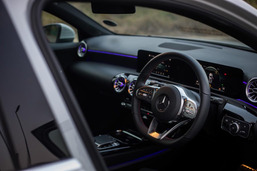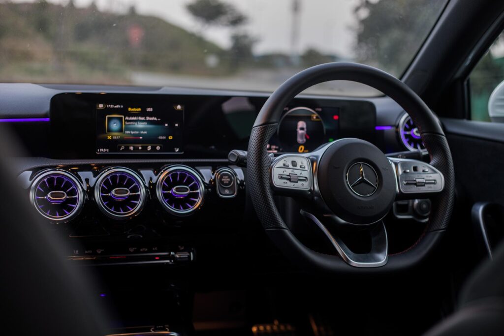 The interior of the A-Class is a classy affair, it’s a major step up from its rivals. The interior is very comfortable and spacious. It’s covered in high-quality materials, but the use of cheaper material is present. It also features Mercedes-Benz’s MBUX infotainment system with the iconic “Hey Mercedes” 😎. The steering is one of our favourite parts of the car. Feels excellent in the hand and the controls are easy to use. The flat bottom design looks beautiful.